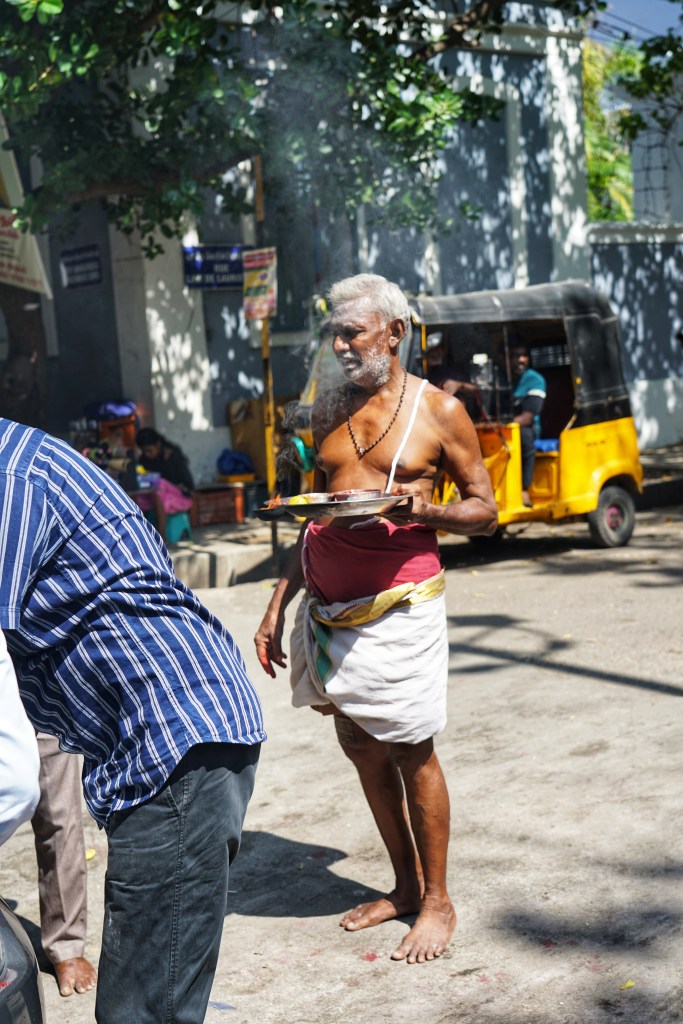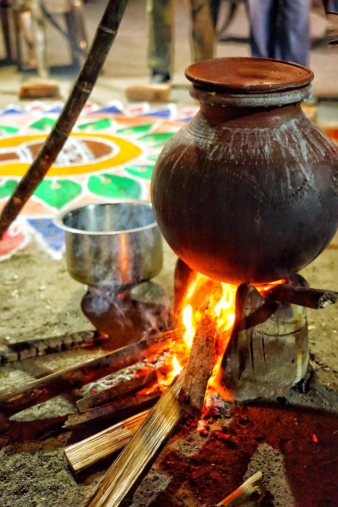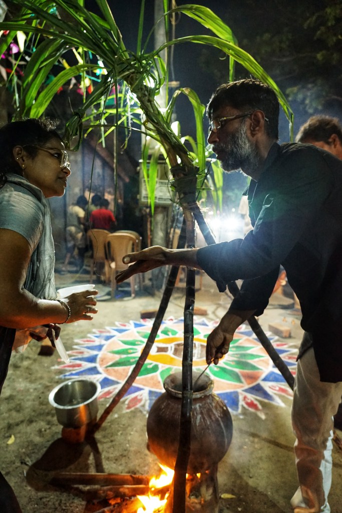 As we stepped out of the hotel that morning, at a street corner near a community hall, a small ceremony was being arranged. Colourful threads, palm leaves, an earthen pot perched over an open flame. We were invited to join, and of course we did. At six sharp, we were back: seated on plastic chairs around a low, smoking cauldron of rice and milk bubbling over the fire, the traffic of the main road roaring just feet away.