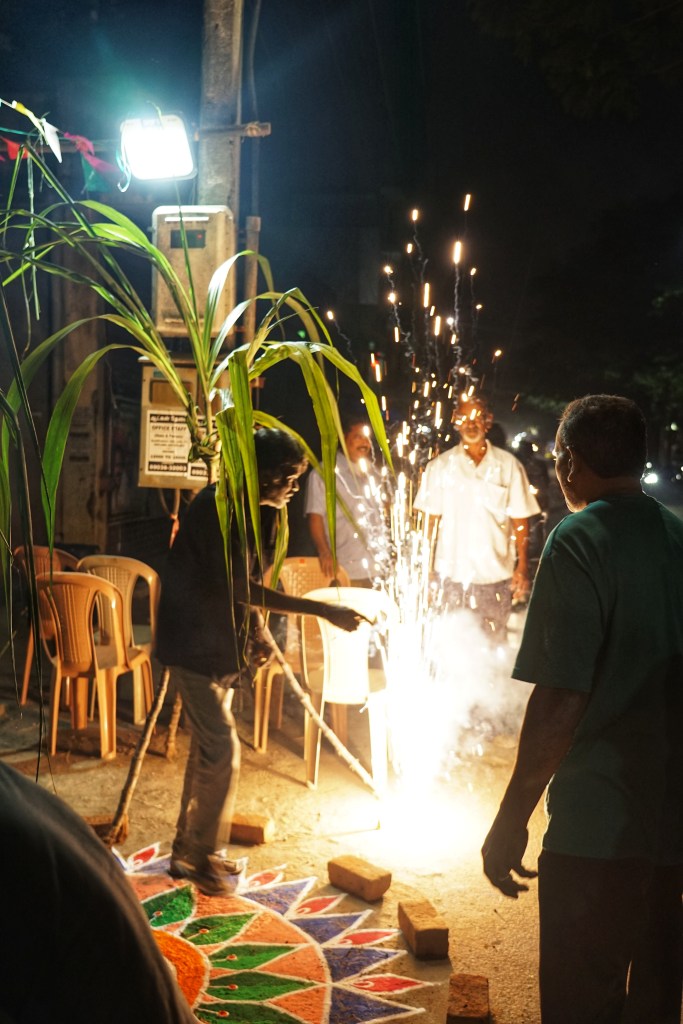 There was laughter as a man and a woman debated whether the pot needed more milk, more fire, whether the sugarcane should go in now or later — their voices rising and falling like little threads of sound that seemed to stitch the moment together. Women and older men stood around, sometimes silent, sometimes sharing quick observations in Tamil we couldn’t follow. A man lit fireworks: bright, sharp streaks carving light into the dusk. And though we knew no one, and no one spoke English, there was an undeniable — familiar — warmth to it. For a moment, unity required no shared language, only shared presence. Community formed not through understanding, but through participation.