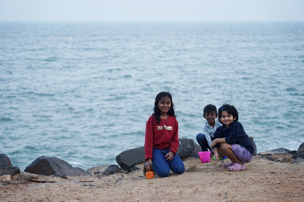 Some days we walk the seaside promenade, the Bay of Bengal unrolling like a metallic ribbon alongside us. Other days we lose ourselves in tiny alleys where scooters inch past fruit stalls and flower vendors, and storefront temples pulse with incense smoke.