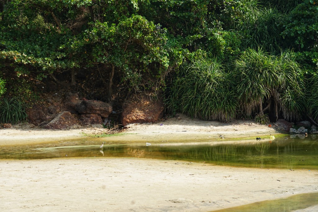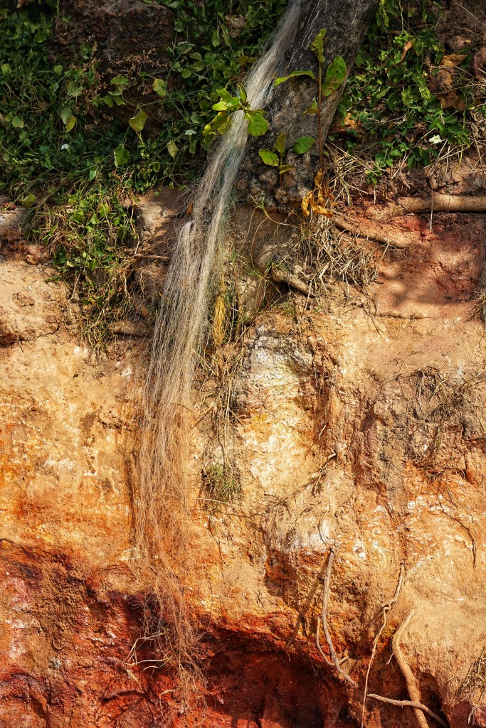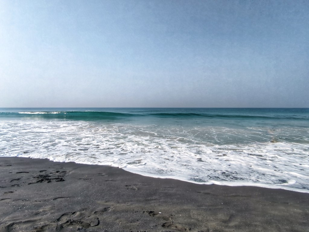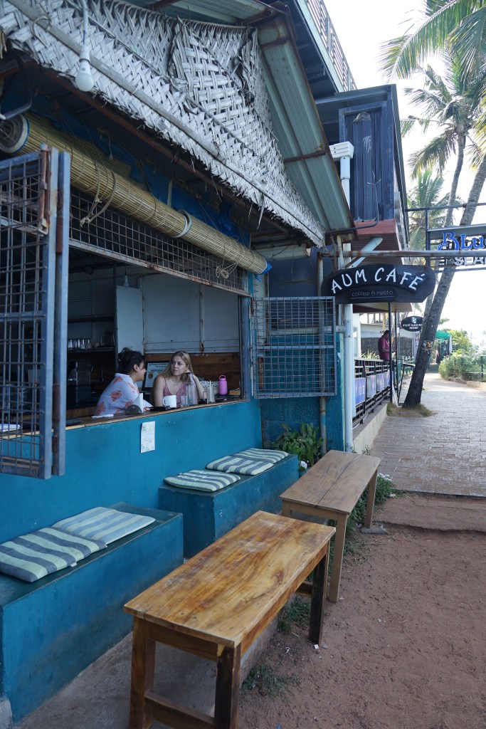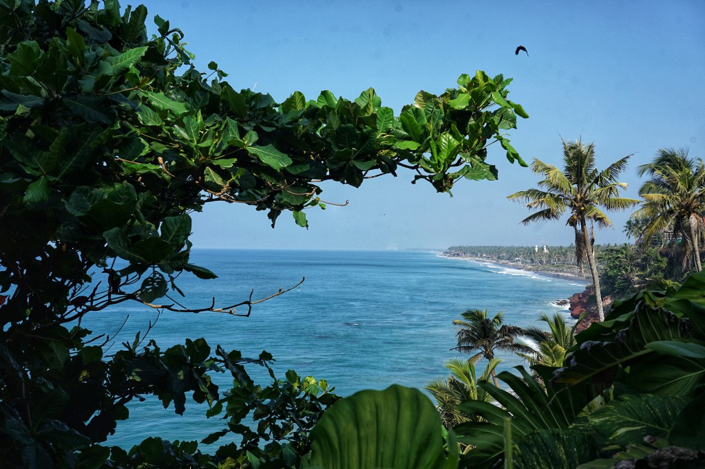 Varkala sits along dramatic red laterite cliffs on Kerala’s coast, where land suddenly drops into the Arabian Sea. Below, waves pound against dark rock and sand; above, palm trees lean into the wind as if permanently listening to the ocean. Frangipani, hibiscus, banana leaves heavy with green. Crows arguing. Dogs asleep in the shade like they’ve surrendered to the humidity of existence. Historically, this is pilgrimage land. Temples. Sacred springs. A place of ritual bathing and release long before backpacker cafés and yoga signs arrived. Spirituality didn’t move in with tourism — tourism moved into something already ancient. We stay at the northern end, away from the main beach stretch. Black Beach, they call it. Fewer people. More wind. Space to hear your own thoughts between the waves.