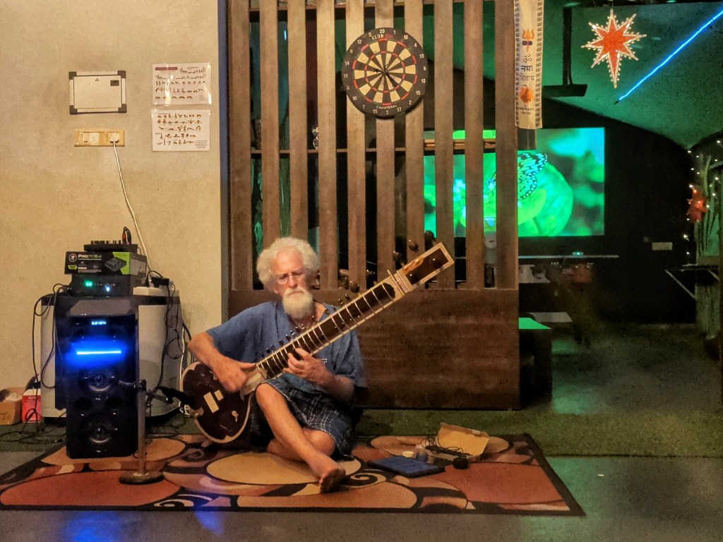 Alongside Ayurveda, Varkala introduces me to sitar music. Our hostel invites Pietro, an Italian musician who has devoted twenty-three years to studying this North Indian instrument. The sitar doesn’t just produce notes; it produces atmosphere. Long, bending tones that seem to search for something just out of reach. Strings that shimmer behind the melody like memory behind thought.