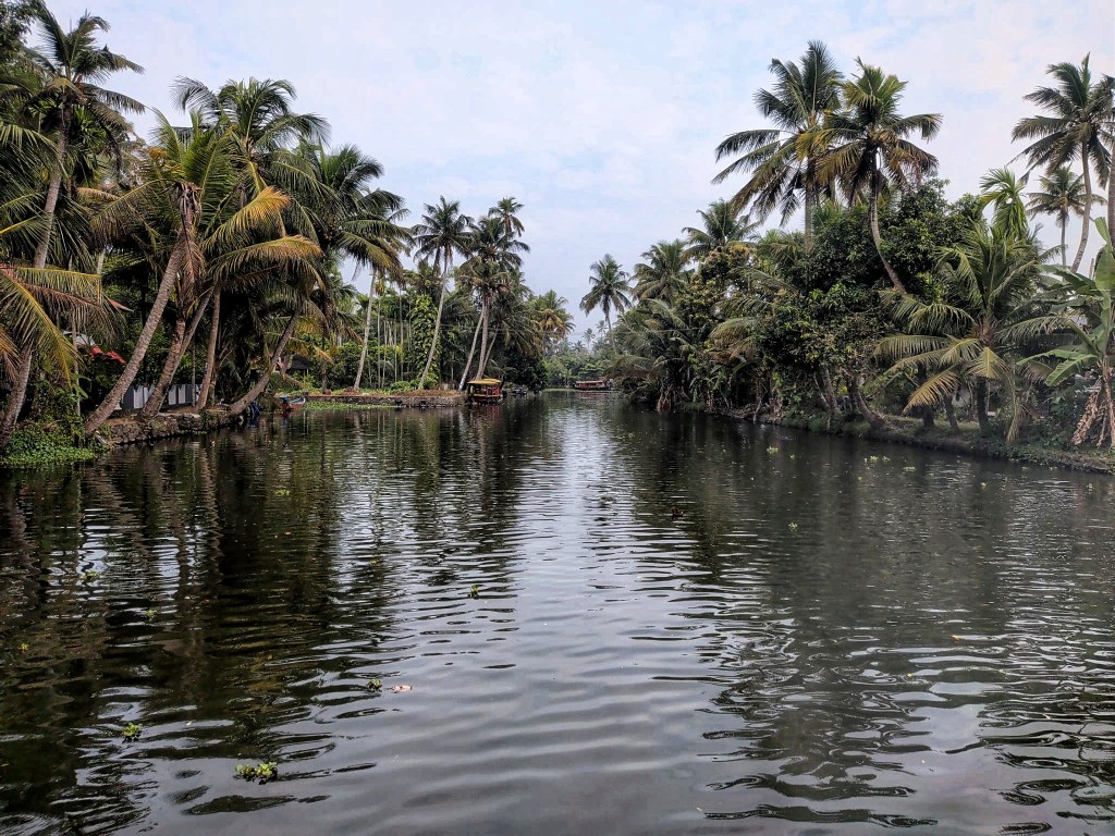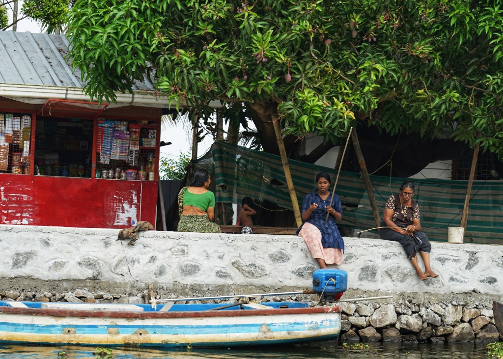 Today, life moves in quiet loops. Local people fish with patience — mostly using just a stick and twine — their eyes on the water, accompanied by cats, watching for a ripple and maybe a catch for themselves. Women wash clothes on stone edges, slapping the fabric into rhythm. Children run barefoot. Laundry dances in the wind. The vibe is peaceful. All the while, tourists drift past in boats. Some smaller, gently passing by. Some bigger — houseboats that stay overnight in the backwaters, anchored near little villages. In the big waterways, this sometimes feels a bit like city traffic; in the smaller channels, it feels balanced. Here, tourism and local life still feel intertwined: two streams feeding understanding rather than erasure.