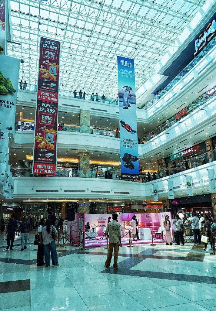 We visit Lulu Mall — India’s biggest shopping mall, opened in March 2013, covering over 185,000 sqm with 300+ stores, a multiplex, family entertainment zones, a hotel and more — drawing over 80,000 visitors daily on average, with millions passing through its doors in its first decade of operation. It overwhelms me completely. Surrounded by gleaming escalators and air-conditioned corridors lined with global brands, I feel — for the first time in India — uncomfortable. We are no longer in reflection; we are in spectacle. This space is about consumption, not connection.