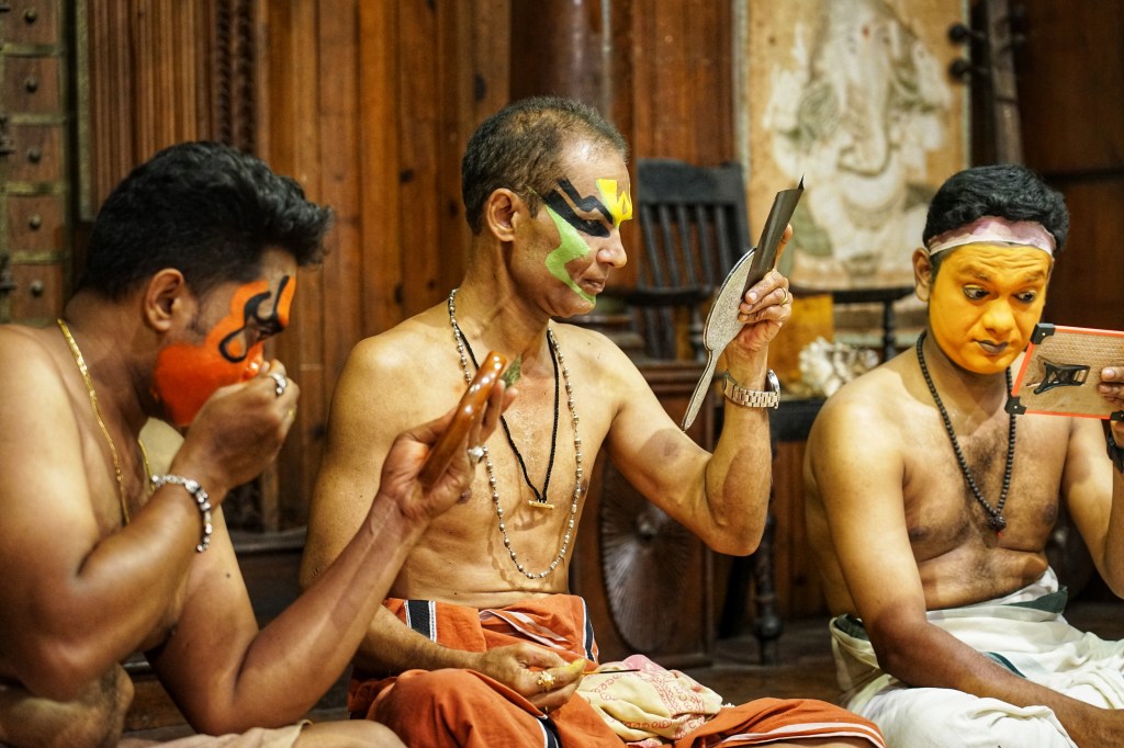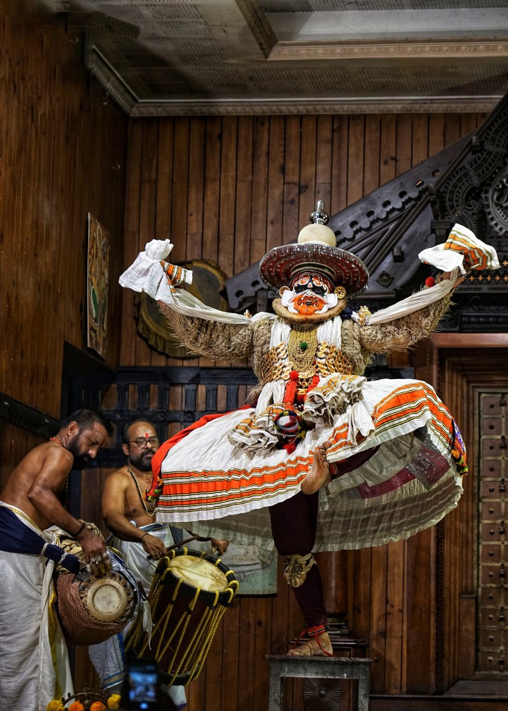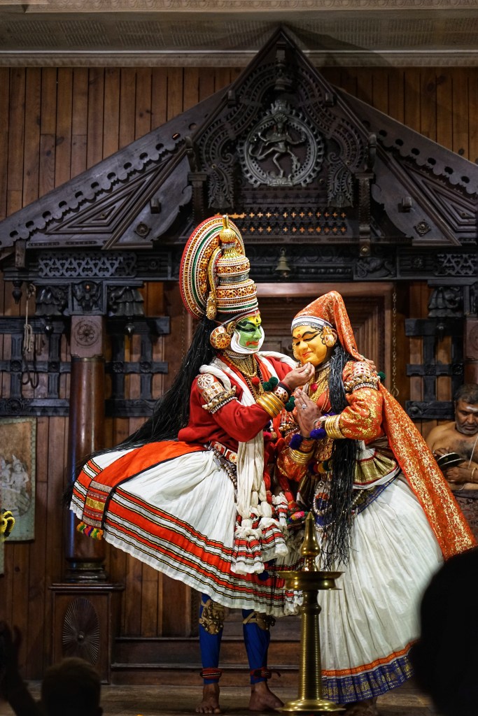 One day we stumble into a Kathakali performance — a centuries-old art form from Kerala that combines story, dance, music and expressive gesture. Performers wear elaborate makeup and heavy costumes, and the rhythm of drums and voices creates a living pulse. Dancers, singers and drummers alike studying for several years before they are allowed to perform on stage.
