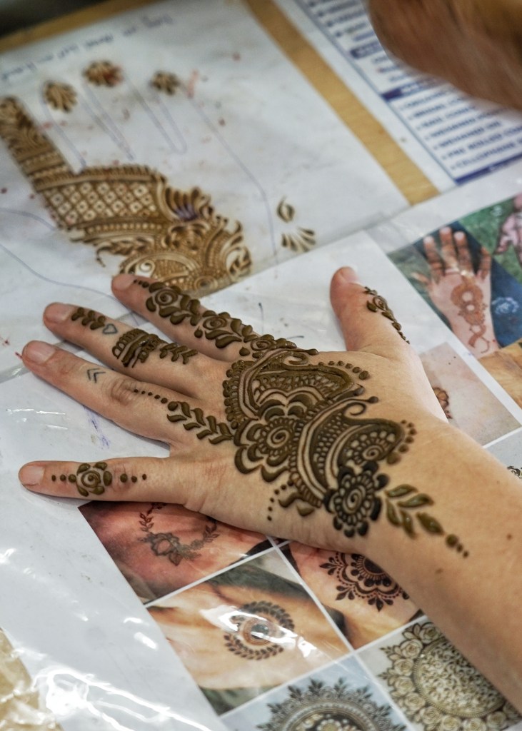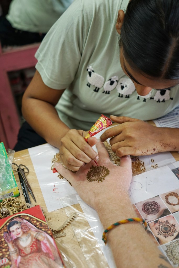 But in the end, what always grounds me most are the small human encounters outside the tourist loop. One day we stop to buy new bindis and meet a girl who has been doing henna for two years. When I ask what draws her to it, her eyes light up: “the love for the craft.” Time seems to stop around her as she draws careful curves on my hand. When she finishes — after an unbelievable fast fifteen minutes — I offer a tip. She doesn’t accept. Instead, she draws a Mehndi on Willem Jan’s hand for free.