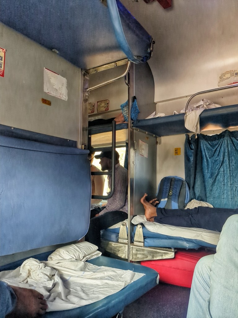 Our compartment is a 3A sleeper: air-conditioned, six beds on one side, two on the other, separated by a narrow aisle where people and chai sellers constantly pass through. We are booked for the lower and the middle one tonight.