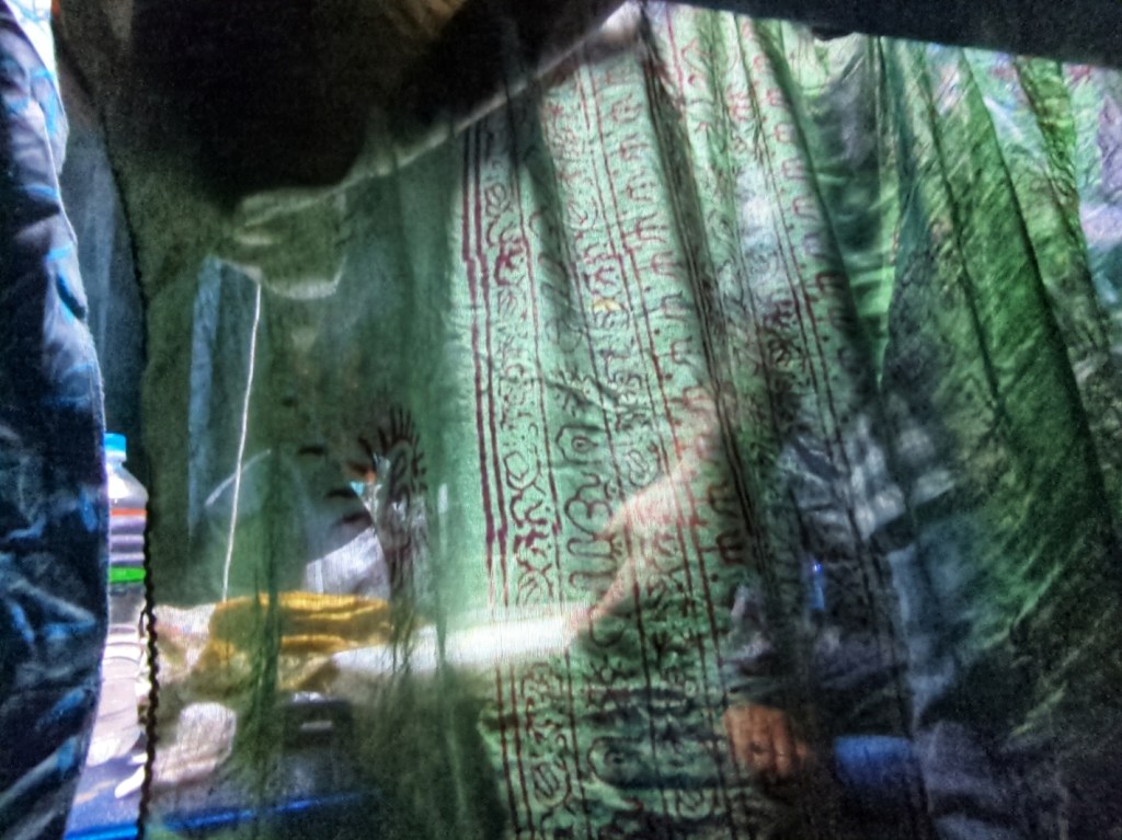 I am quite literally surrounded by men, and very aware of it. No make-up. The widest clothes I have with me. No jewellery. An old strategy: reduce the outline of the body, lower the signal, try to become invisible. Somewhere further down the carriage there are other woman, but the metal walls leave me strangely isolated. The men don’t speak English, and we don’t speak their language, so there is almost no communication between us. It makes hard to connect and it adds to the strange atmosphere. Somehow we agree with them to go to bed in about an hour. Or so we think. Around nine Willem Jan and I prepare our beds: two cotton sheets, a woollen blanket and a pillow. The others keep talking — phone calls on speaker, laughter filling the metal shell of the carriage. I lie down, unsure how to position my body. Every direction feels exposed. I am no longer at eye level; I am a horizontal surface in their field of vision, a buffet of limbs and fabric. Maybe half of it is only in my head, but that doesn’t make the discomfort disappear. So I use my old hostel trick and hang one of my scarves up to create a small curtain — a suggestion of a border. I feel absurdly proud of this little invention and for a few minutes I rest inside my self-made room. My nerves calming down. I am always surprised by how much impact such a tiny piece of fabric can have. Then two more companions arrive with food, and the space fills with more movement, smells and crinkling plastic. I am happy for them, truly. I want them to enjoy their evening. I just want a little rest too. Eventually they prepare their beds as well. Pullover off, night mode on. The guy beside me lies down and within thirty seconds the first of many thunderous snoring breaths fills the compartment. I laugh out loud. What else can you do?