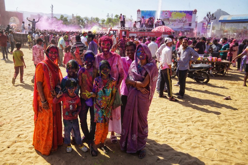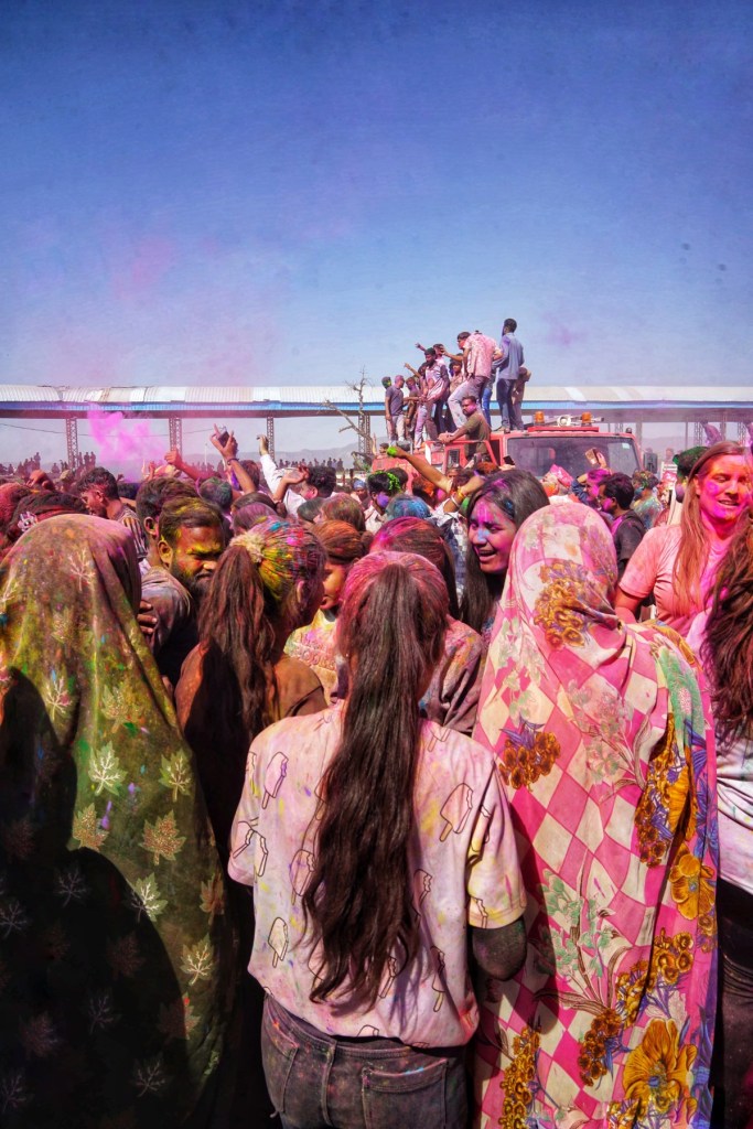 As it gets more and more crowded, we move on to a much bigger plaza outside of town. Here, everything scales up. At some point, a fire truck starts spraying water into the crowd. People cheer, jump, dance into it. Powder turns into color-streaked water running down faces and bodies. It’s intense. A bit too intense for us, so we leave it fir the Rest to enjoy. And from the side, in the shade, it becomes something else again. Short, easy conversations with strangers who feel strangely familiar in that moment. There’s a lot of laughter. No real agenda. Just being there.