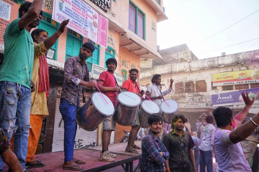 Holi itself turns out to be one of the most communal, joyful things I have ever witnessed. It begins early in the morning, almost gently. In the streets, people approach each other with small amounts of colored powder, lightly touching it to cheeks or foreheads. A soft “Happy Holi” is exchanged. It feels intimate at first. Personal. Like the day is easing itself open. We make our way to a small plaza where a drum band is setting up. At first, it’s just a few people. Then, within minutes, the space fills up—fast, almost unexpectedly so. The rhythm builds, and with it the energy. Clouds of color start to rise into the air, drifting, colliding, settling on skin and clothes. It becomes harder to tell who is who. Everyone slowly turns into the same moving canvas.