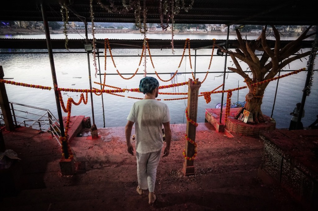 We walk along the edges and pause for a moment, watching people—different generations—bathing in the holy water. It feels both ordinary and not. Then a man approaches us. He presses flowers into our hands and starts guiding us into a puja—a small ritual, an offering with prayers, petals, and repeated words. A moment of connection, at least in theory. We know what is happening. It might come from a genuine place of sharing, but there is almost always also the expectation of some money in the end. And that’s okay. That’s how it goes. This time though, something shifts.