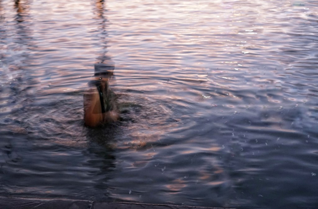 Next to me, a woman is stepping into the water, held by her husband. She looks over and smiles. A simple, beautiful smile. The water glitters. And for a moment, it’s just that. The water and me. Nothing else. It moves in this soft, steady rhythm. Almost like it’s whispering. And then I do it: I step fully into the lake. With all my clothes on. I stand there. And I go under. Once. Twice. Three times. Holding my nose, eyes closed. It’s quiet down there. Not empty—just quiet in a way that doesn’t ask anything from you. The water moves around me, over me. Take it, I think. Take whatever I don’t need to carry anymore.