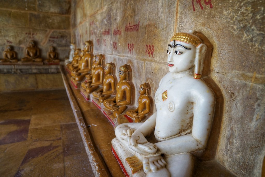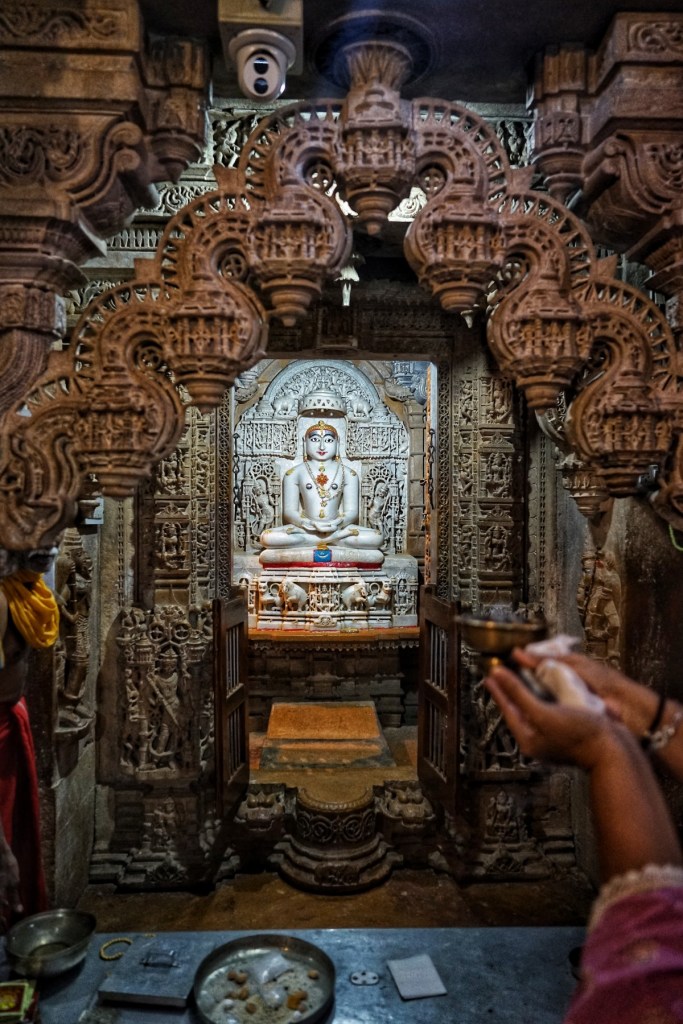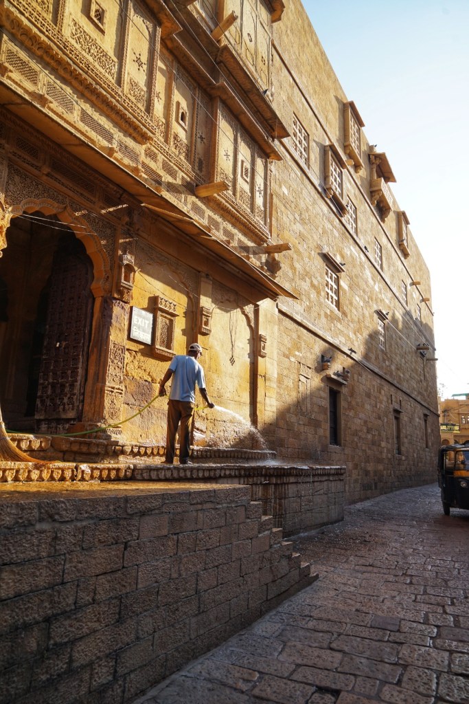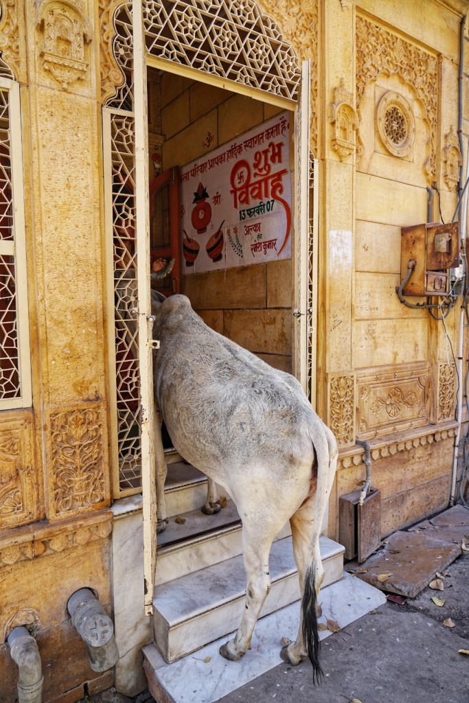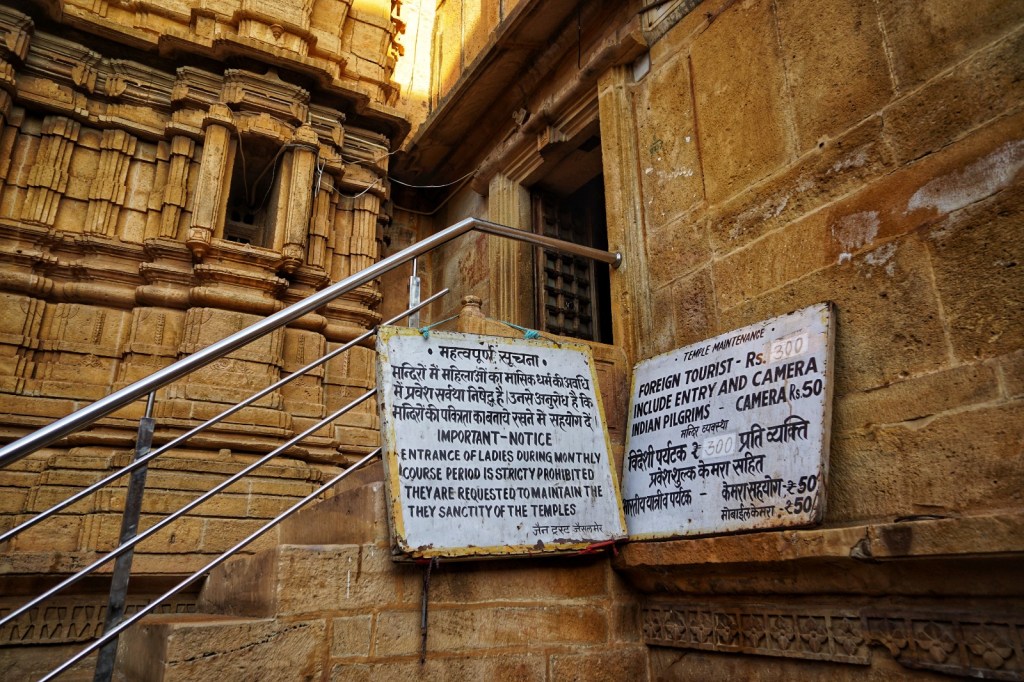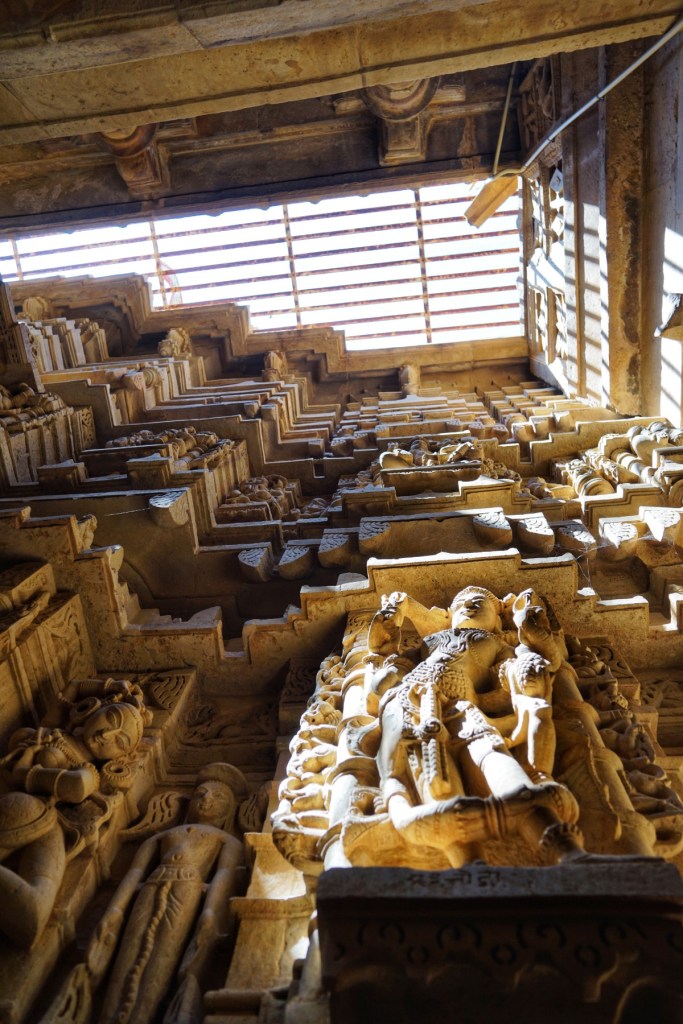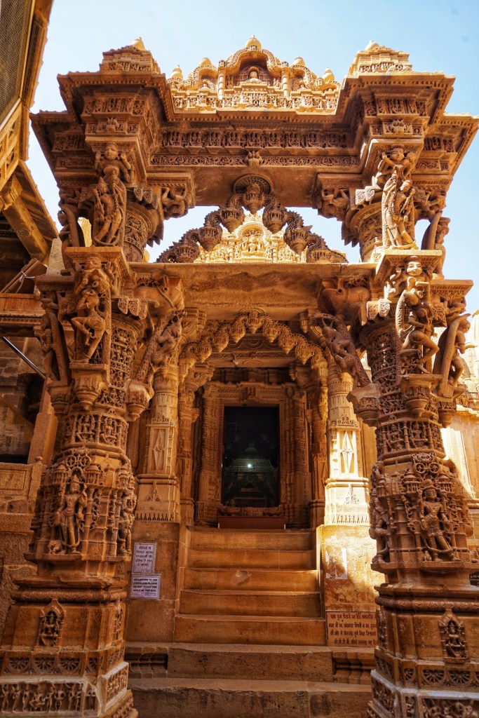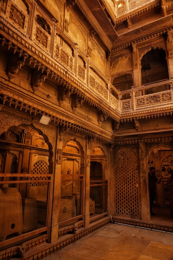 Soon, we feel like moving from outside the Fort to within. Almost by accident — just walking by — we meet our new host, who warmly welcomes us into one of his most beautiful rooms. It has a window seat that looks like it belongs in an oriental movie, with a direct view of the big Jain temple, that we soon visit ourselves. Here I feel peaceful, connected and the religion that beforehand I knew nothing inspired me quickly to read up about it. Jainism is one of the oldest religions in India, rooted in principles of non-violence, truth, and non-attachment. At its core lies a deep respect for all living beings — to the extent that some followers avoid harming even the smallest insects. In Jaisalmer, this philosophy is not only practiced but also visibly embedded in the city’s architecture. The Jain temples inside the Fort, built between the 12th and 16th centuries, are intricately carved from the same golden sandstone, yet feel almost weightless in their detail. Jaisalmer became an important center for Jain traders along ancient caravan routes, which helped the religion flourish here — leaving behind both spiritual and cultural imprints that still shape the city today.