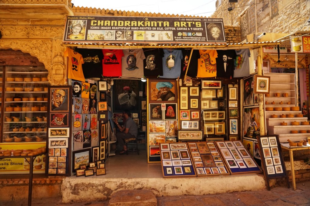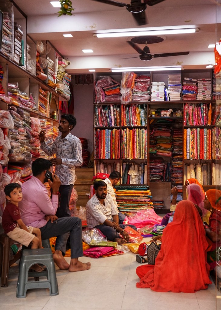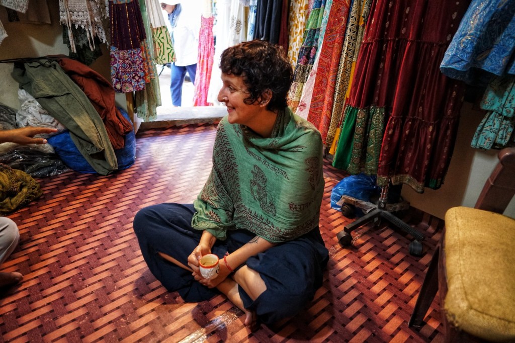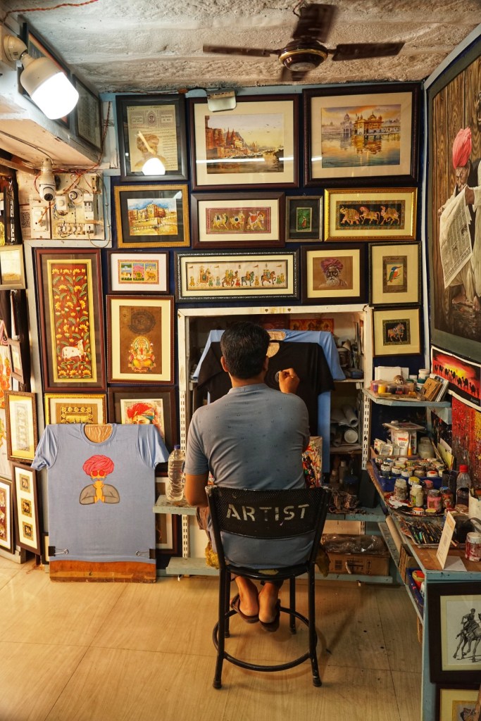 But it doesn’t stop there. Rajasthan is also known for its tradition of miniature painting, so we find ourselves stepping into a small shop and studio. Miniature painting in Rajasthan dates back centuries, once practiced in royal courts, where artists created highly detailed scenes of mythology, court life, and nature using the finest brushes — sometimes made from a single hair. Even today, the process is slow and precise, each line carefully placed, each color built up layer by layer. Inside, we meet a whole family who have been practicing this craft for generations. They work side by side, sharing techniques, developing new ideas together. It feels not simply like a business and more like a quiet continuation of something much older. We are invited for chai into their home, sitting together on a bed, talking, laughing, sharing a moment that feels simple and generous at the same time. Willem Jan ends up placing a commission for two T-shirts, and we buy two paintings on rolled canvas — pieces that will travel with us all the way back to Europe.