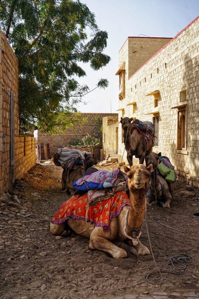 This little Fort town quickly turns into a place where we want to linger longer, and we start scratching places from our Rajasthan itinerary, leaving us with only Udaipur before returning to Mumbai. This allows us not only to connect more deeply with the place and its people, but also with ourselves — and the question of whether we want to visit the desert, and how. Willem Jan dreams of the dark night sky, I of sand dunes and wildlife. We both want to experience it in the most connected way. No glamping tents, no party scene — something grounded. Without really knowing what that means or how to achieve it. Since arriving in Jaisalmer, we’ve been flooded with offers for “non-touristy” desert safaris. All of them, in the end, follow the same pattern: driving for hours into the desert by jeep, stopping at certain oases or villages or ruins, eventually meeting some camels and continuing on their backs. Sleeping on simple beds under the open sky — or, depending on budget, in something that calls itself a tent but feels more like a glamping setup. Everyone assures us their experience is different. Less crowded. More authentic. And, more pressing for me: that their camels are treated well. But when I ask how many people sit on one camel, the answer is too often two. And when we ask how long the rides last, the answer is, again, too often two hours. The offers range from 3,000 to 4,500 rupees. And none of them feel right. To be honest, if Willem Jan hadn’t kept pursuing it, I probably wouldn’t have seen the desert. And definitely wouldn’t have ridden a camel. But I did. Because the longer we stay in Jaisalmer, the more things seem to quietly point us toward Khuri — a very small village, about 45 kilometers from Jaisalmer, reached by local bus. To Badal House. To one of their camel tours.