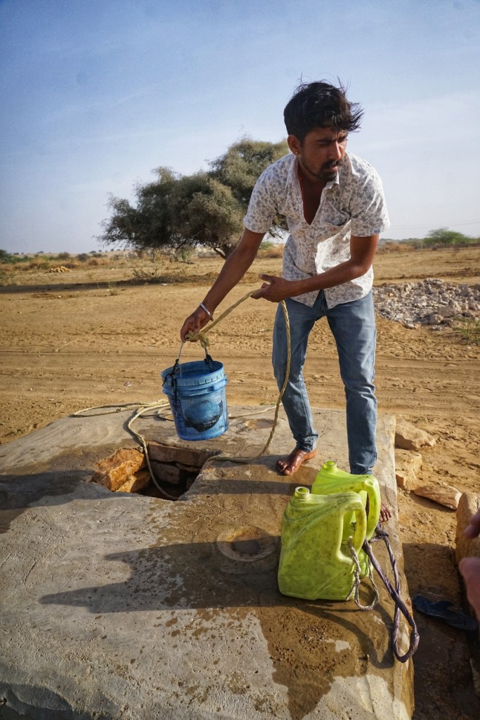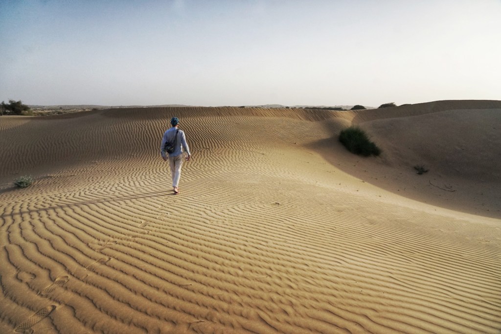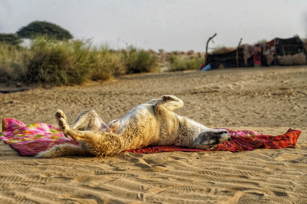 As we enter the desert, a dog joins us. His name is Badu, and he will stay with us the entire time we are out there. Keeping us company, but also, in his own way, protecting his flock. He always comes when Sarup has a tour. And even when he doesn’t, he still comes out here — to be with his companion. I like him more and more.