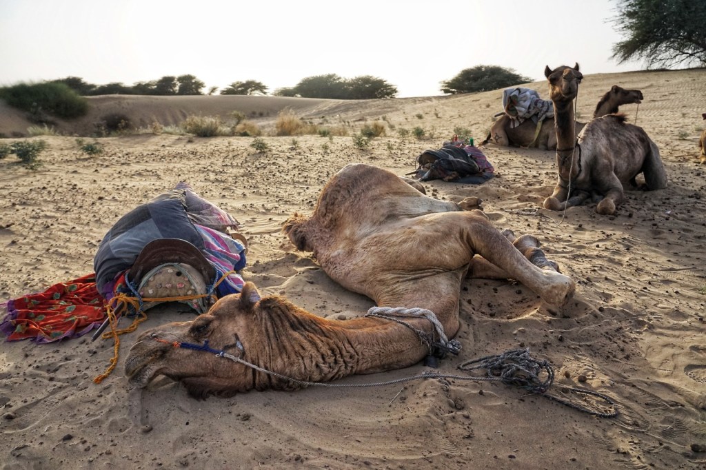 I watch Sarup as he prepares the animals: Bob Marley and Michael Jackson are the names of the ones we will ride. Blanket on blanket, padding on padding, then the saddle, tightened carefully with straps. More layers added — extra cushioning for our European buds. No decoration. No bells, no tassels, no unnecessary embellishment. But the moment that makes me step into it fully happens elsewhere. In what he seems to think is an unobserved moment, Sarup gently strokes Bob’s neck and leans his forehead against the camel’s long, soft fur. The camel responds by lowering its head onto his shoulder. And I know — this is right.