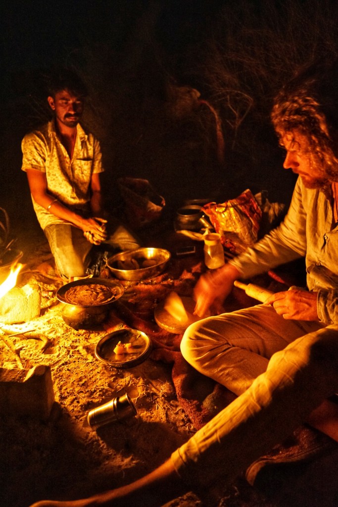 We ride for about forty minutes. Long enough to enjoy it, long enough for our buds. Again, I feel grateful we didn’t choose one of the other tours. A quiet thought that keeps returning throughout the evening. When we reach dunes that seem untouched, where no one else has set up camp. When Sarup starts preparing dinner, his cooking pot placed between the small holes of desert mice, making the best tea I had in India so far. When we make chapati together, rolling the dough in the sand-dry air. When Sarup sets up our beds — thick, cotton-filled blankets directly on the dunes, with a few more to cover us through the night. And his own, about twenty meters away, arranged in exactly the same way. When night settles in, and the only things we hear are the wind and Badu moving somewhere in the dark. And the only thing we see is the vast sky, scattered with what feels like millions of stars.