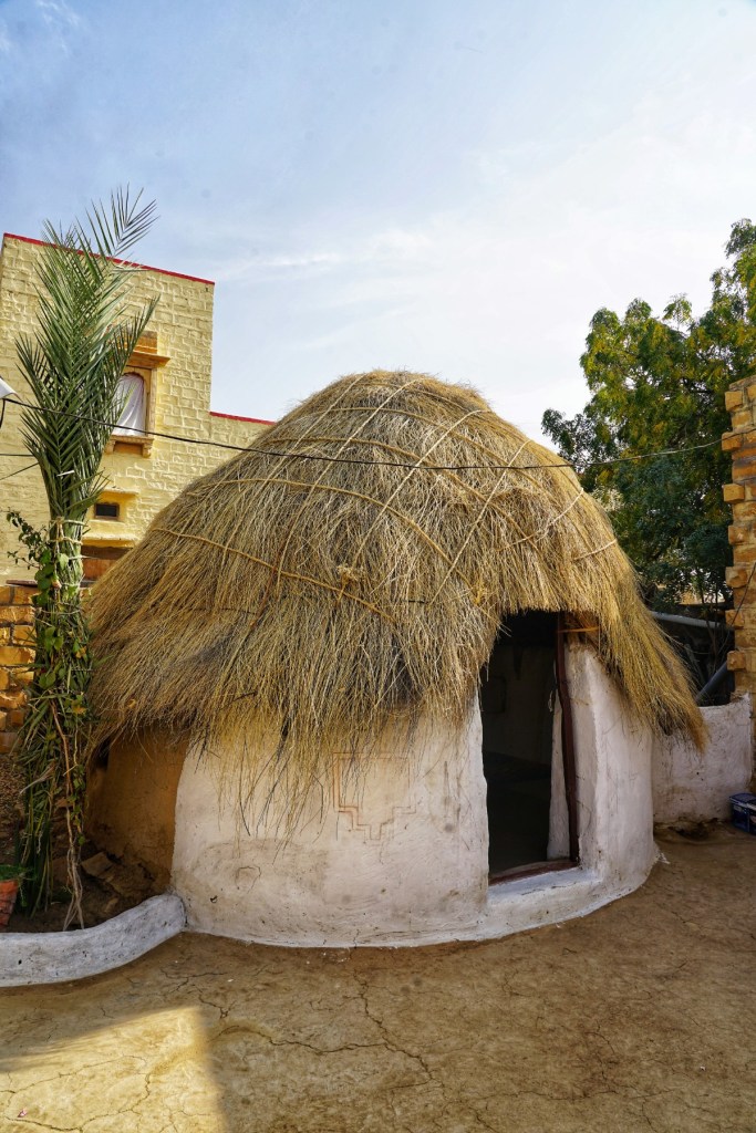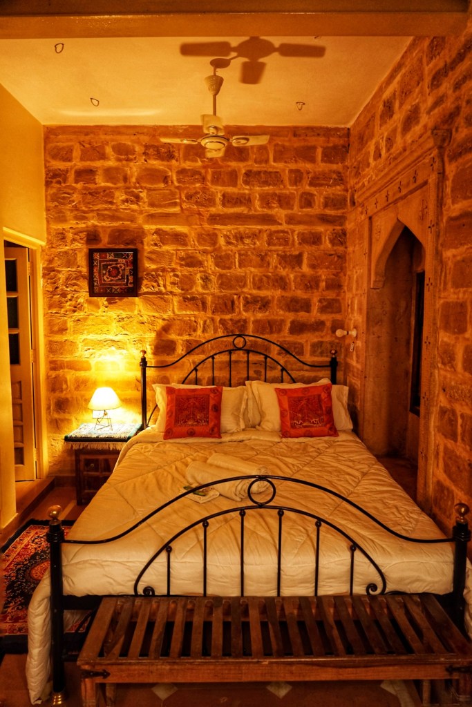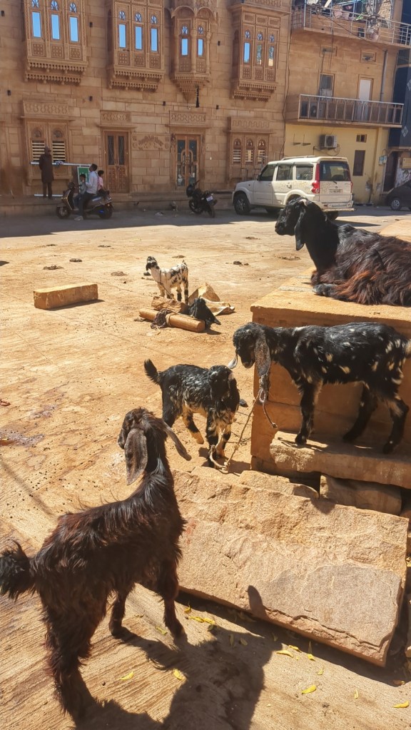 Our first place to stay in Jaisalmer lies outside the Fort area — a small hotel with (very) tiny, cute rooms that are surprisingly cool, considering the 45 degrees the city welcomes us with. For the first few days we make our way into the Fort passing through crowded streets with dogs, cows, and scooters that once again challenge my patience — and my resilience for the ever-present honking. And there we experience what makes Jaisalmer feel so distinct. It is how seamlessly history and everyday life blend into one another. Laundry hangs between ancient walls, children run through narrow lanes, motorbikes squeeze past intricately carved facades. The Hawelis, with their delicate stone latticework, seem almost too detailed to be real, like something imagined rather than built. At its center lies the Fort. It is not a monument frozen in time — it breathes. And then there is the desert itself — never far, always present — shaping the rhythm of life with its heat, its stillness, its vastness.