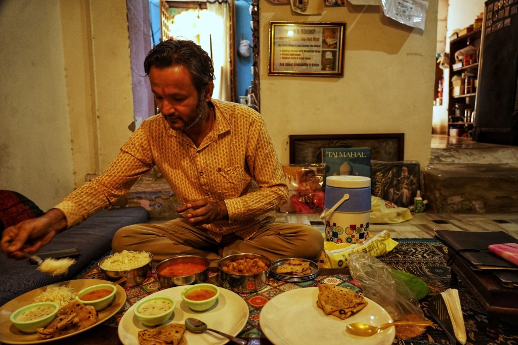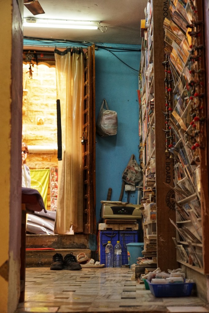 On our second day, I lead us to a place inside the Fort that I had marked beforehand. I found it on someone’s blog, or Instagram, or Tripadvisor. Maybe someone recommended it, or maybe it was just instinct guiding me. I can’t quite remember. But it truly felt like a gift to find The Traveler’s Cup. A small coffee place with honest food, good prices — and yes, they are not lying: the best coffee in Jaisalmer, as Willem Jan immediately notes. In the coming days, this place becomes more than just a hiding spot from the sun, where we sink into cool cushions and drift into long conversations. With every encounter, the connections deepen. What begins with small talk over coffee slowly unfolds into something more personal. We linger longer, return without planning to, are recognized, welcomed back. Stories are shared — not all at once, but in fragments, over time. There’s a quiet kind of hospitality here, one that doesn’t try too hard, yet stays with you. At some point, we find ourselves helping with their Tripadvisor page, sitting behind a laptop in the afternoon heat. Another evening, we are invited to eat a home-cooked meal, prepared by the owner’s wife. It feels less like visiting a place, and more like being gently folded into it.