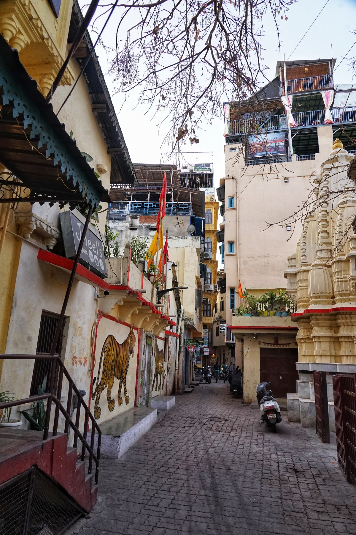 After settling in, we begin our soon-to-be daily strolls through the city. Very quickly, two things stand out: Udaipur feels far more tranquil than expected for a city of its size. We spend time walking along the lakes, watching the light shift across the water. There are boats, but many of them remain tied to the shore, gently rocking without purpose, left there for more than one season untouched. Rooftop terraces stretch above us—beautiful, inviting, and strangely empty. It gives the city a slightly suspended feeling, as if it once moved at a different rhythm and is now slowly finding its way back.