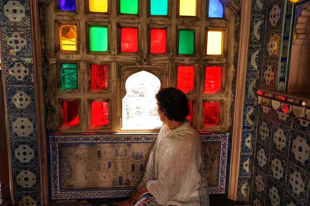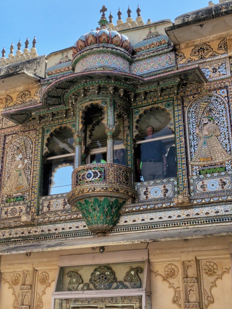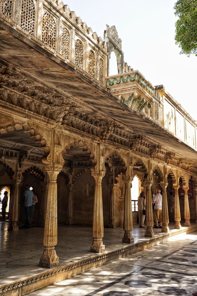 Or when we enter the old palace—City Palace Udaipur—its grandeur is undeniable, layered over centuries by the rulers of Mewar, each adding balconies, courtyards, fragments of their time. And yet, despite its scale and history, it doesn’t feel overwhelming. The rooms, with their intricate tiles and faded colors, carry a quiet dignity rather than opulence. Light falls softly through carved windows, dust dancing in slow motion. There are other visitors, of course, but even here, movement feels hushed, almost respectful. It is less a monument to power than a place that has settled into itself—its past still present, but no longer trying to impress.