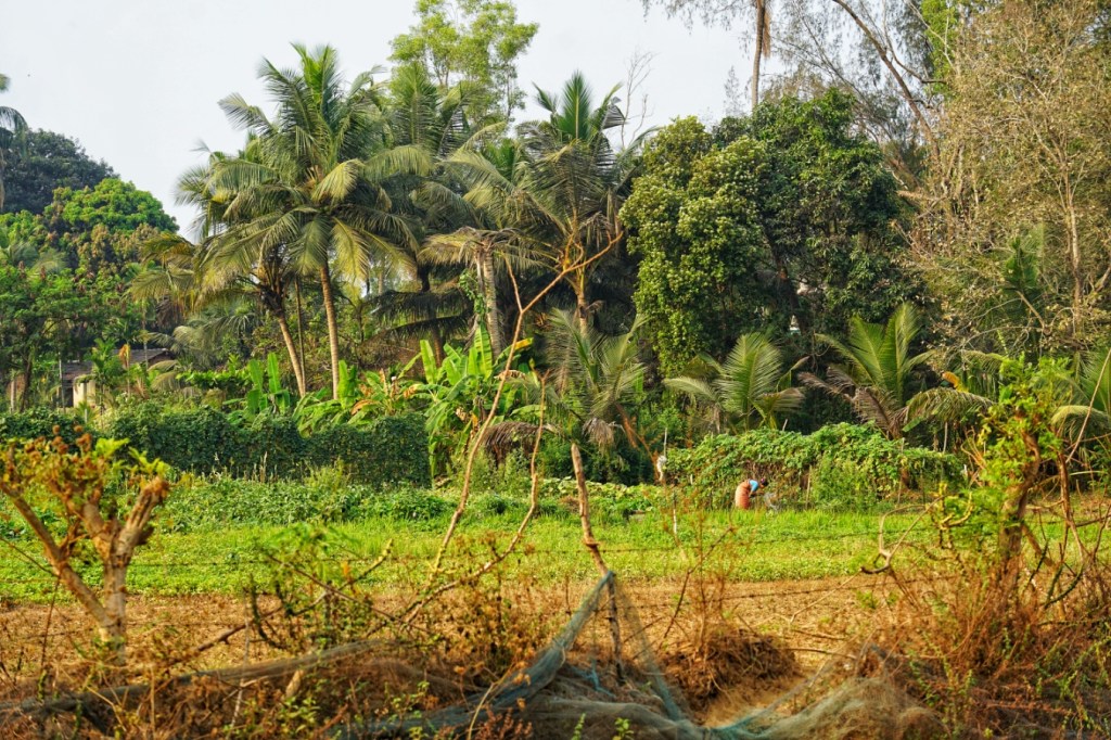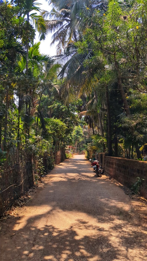 We move through lush greenery every day. It isn’t decorative—it’s alive and dense. Coconut palms lean lazily into the sky, their leaves clattering softly in the heat. Banana plants unfold in wide, fragile layers, their greens softer, almost translucent in the sun. Between them, narrow paths cut through a landscape that feels both cultivated and wild, as if nature and daily life have agreed not to interfere with each other too much. The air smells faintly of earth.