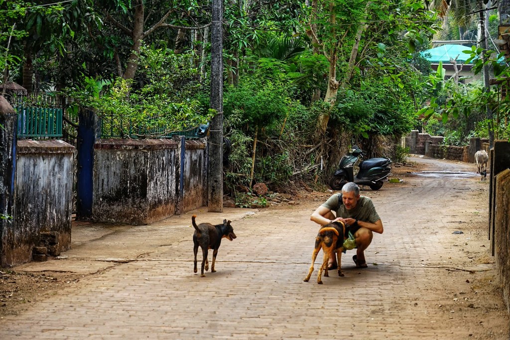 Henning cuddles every dog that wants to. Without hesitation, without overthinking—he simply kneels down, opens his hand, and meets them where they are. There is something very immediate in the way he does it, a kind of natural ease that doesn’t create distance first. Watching this also mirrors something in me. My own relationship with animals along this journey has been more cautious at times.