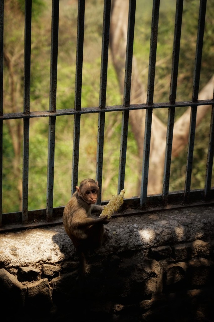 When we arrive on Elephanta Island, the first welcoming committee is not spiritual, historical, or human — but monkeys. Hordes of them. They sit on railings like seasoned supervisors. They drink from abandoned bottles with casual entitlement. I enjoy watching it. Animals versus animals. Humans clutching plastic bags, trying to negotiate ownership. Monkeys entirely uninterested in concepts such as property law. They slap snacks straight out of people’s hands with the precision of trained pickpockets. One second you have chips, the next second a monkey has chips, and frankly, fair enough.