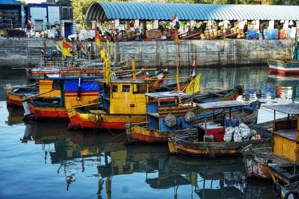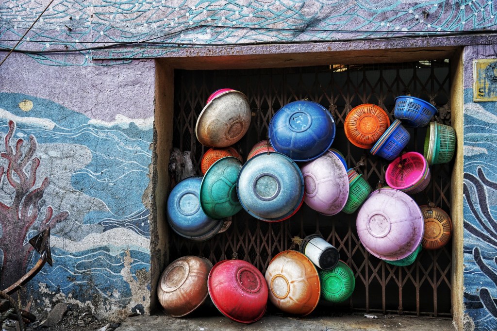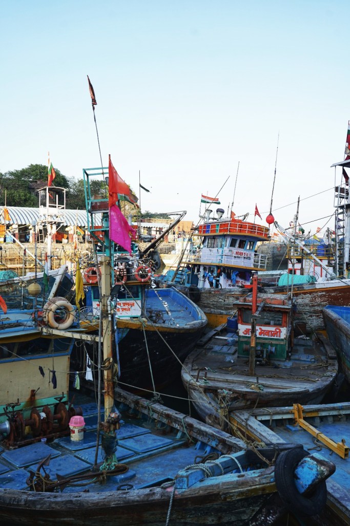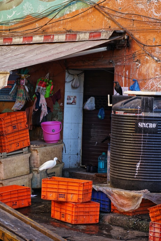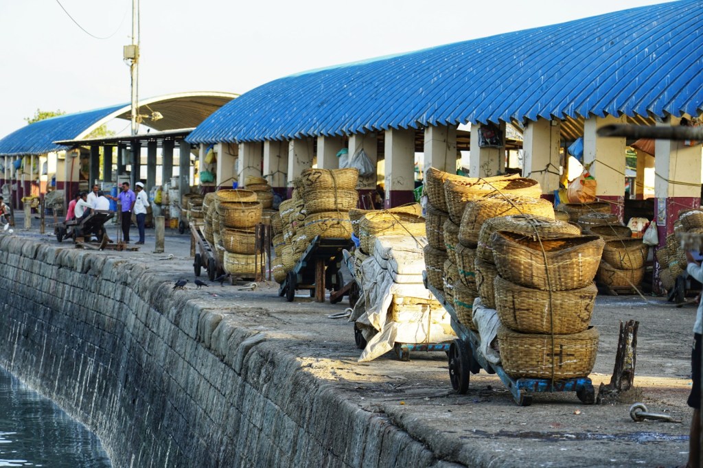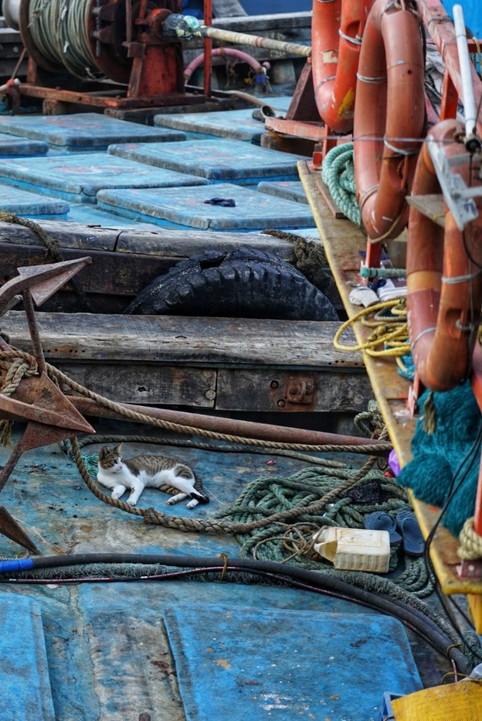 In the afternoon we go to see the local fish market. Wet ground, shouted instructions, gulls circling overhead, the smell of salt, diesel and fish strong enough to become almost architectural. Everything moves quickly, but not chaotically. What fascinates me most are the boats. So many of them. Packed tightly together, pressing into narrow spaces that by all visible logic should not accommodate even half their number. Painted hulls knocking gently against each other, ropes crossing in impossible angles, engines sputtering, men jumping from one vessel to the next with the balance of lifelong practice. There seems to be no room for anyone, and yet somehow everyone gets through. Beautiful murals cover parts of the surrounding walls — bright colours against labour and weather. No foreigners seem to be here. We are noticed, of course. Looked at. But in the warm, curious way I have come to recognise. A few smiles. Small nods. No fuss.