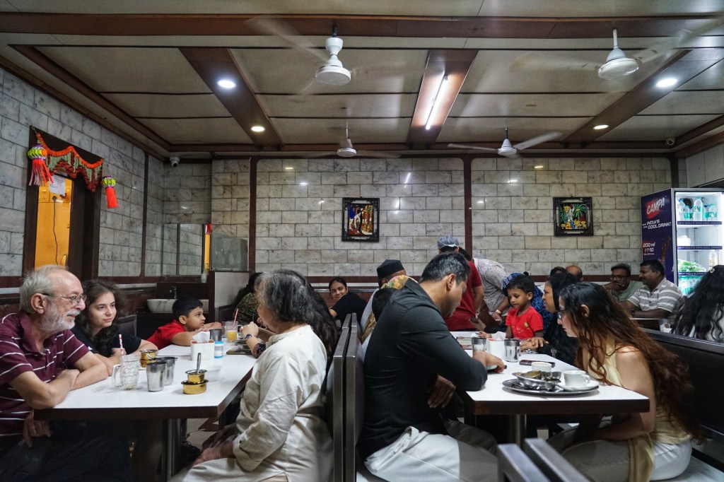Again and again, we come across bougie cafés — one of them even called Boogie Café — the kind of places in Europe I probably wouldn’t even walk into. Simply not my crowd, and certainly not my wallet. Speaking of wallets: the price level in Mumbai is more than double compared to almost every other place we stayed in during this journey through India, with maybe parts of Pondicherry as the only exception. Accommodation, coffee, meals — everything seems to come with an added metropolitan premium. Even in iconic places like Leopold Cafe, so often recommended and woven into the mythology of the city, we suddenly pay far more than we have become used to elsewhere. I notice how quickly money can shape atmosphere. How a place can feel less relaxed the moment every order becomes a small calculation. So I feel genuinely relieved when we finally find a deeply local restaurant again — stainless steel tables, fast hands, ceiling fans, no performance attached to it. South Indian dishes, honest portions, and prices that allow you to exhale. It was a tip from our amazing hotel manager. Sometimes the best luxury is simply ease.