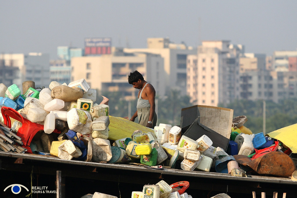 One of the first workshops we see is plastic recycling. Three people sit on the ground in a dim room surrounded by mountains of future recycled plastic — but for now, simply garbage. No gloves. No protective shoes. Everyday clothes. The only real light comes through the open doorway. Hands moving constantly through colour, texture, residue, waste. “It is good work,” the guide tells us. And maybe economically, it is. Regular work. Necessary work. Work with demand. Still, I cannot help feeling an inner contraction as I look at them there. The body often reacts before ideology has formed its opinion.